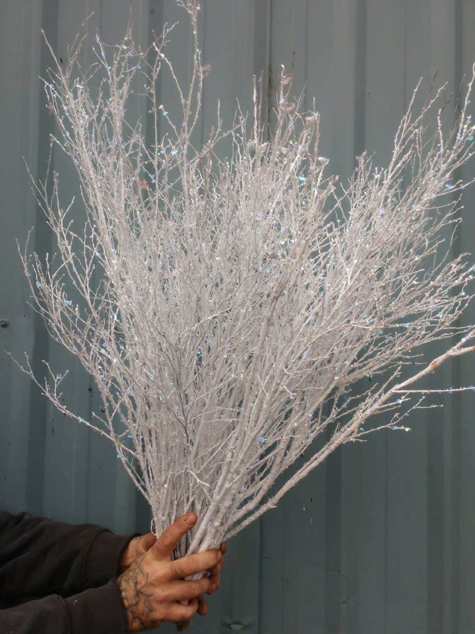 This product has quickly gained in popularity. We use a base color: white, silver, gold, plain, or custom, and then we apply clear, gold, silver, mix, or opaline flakes. Choose your custom branches today!